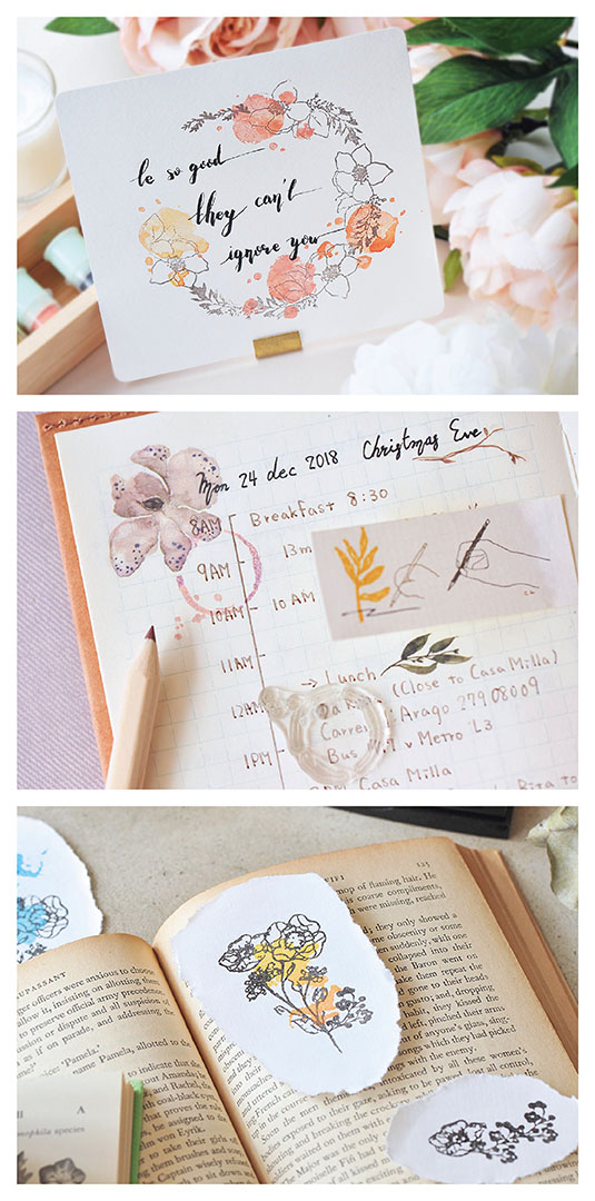 水晶拼貼印章,這此的新系列將水彩筆刷章轉化成具象的陰刻花草,和美麗的花草線條相輔相成,大膽的疊蓋,營造出花影搖曳的美景。